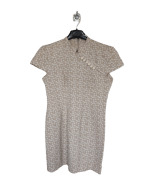 Hecho de una mezcla de algodón y viscosa, este vestido es muy suave, ahuesado y se oxida. Su forro interno suave le da más cuerpo al cuerpo. El diseño en tonos marrón y beige está completado con un detalle de flores bordadas para un toque más refinado. El cuello de la parte delantera se cierra con botones de madera cruzados para una sensación irresistiblemente retro.