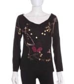 Camiseta de mujer de segunda mano Boba negra con bordados en color rosa, blanco, mostaza, granate y marrón; y abalorios talla M.