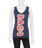Top mujer Chupa Chups color azul marino, de estilo nadador con la palabra ¨love¨ naranja, verde amarillo, azul oscuro, morado, rosa palo, rojo y rosa con brillantina plateada, talla XS.