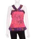 Top mujer Missing Johnny de tirantes anchos cruzados en el pecho, color rosa fucsia y morado con estampado negro y naranja y brillantes en la parte frontal, talla L.