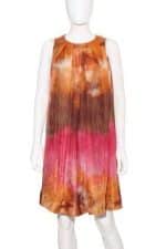 El diseño único de este vestido incluye un degradado en tonos desierto realmente hermoso. El detalle de fruncido que se encuentra debajo del escote agrega una capa extra de elegancia, mientras que el cuello en pico redondeado agrega un toque de sofisticación. El vestido está sujeto en el centro por un cinturón de cintura ajustable.